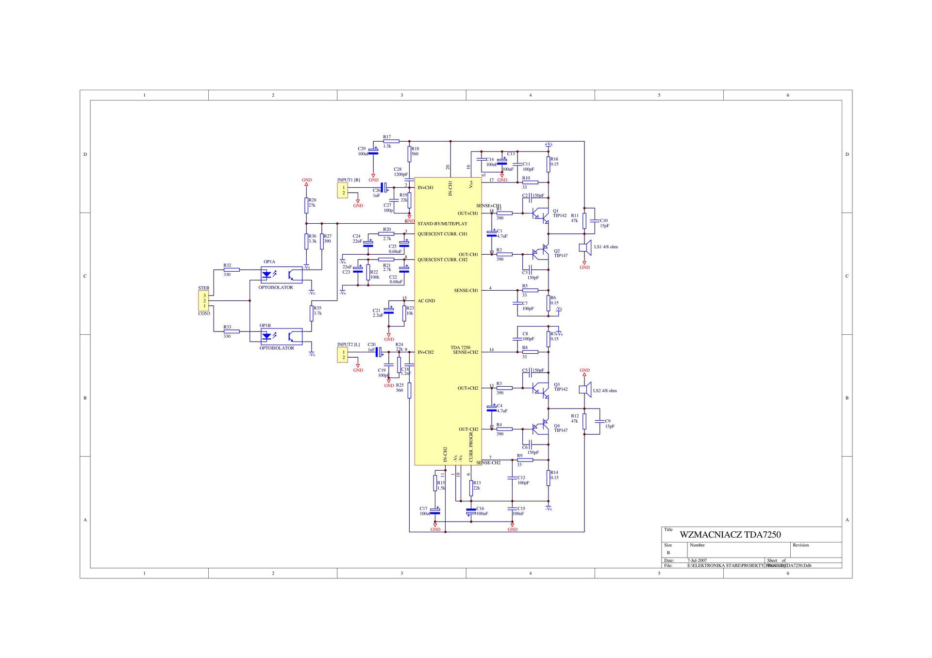 ... az van, hogy kimeneten csak nagyon halkan szól a zene, amit a bemenetre köttem. Vettem bele új TDA7250-et, és TIP142 TIP147 párost mindkét oldalra, de a helyzet ugyan az. Merre keressem a hibát? mellékletben a bekötés, ami szerint csináltam.