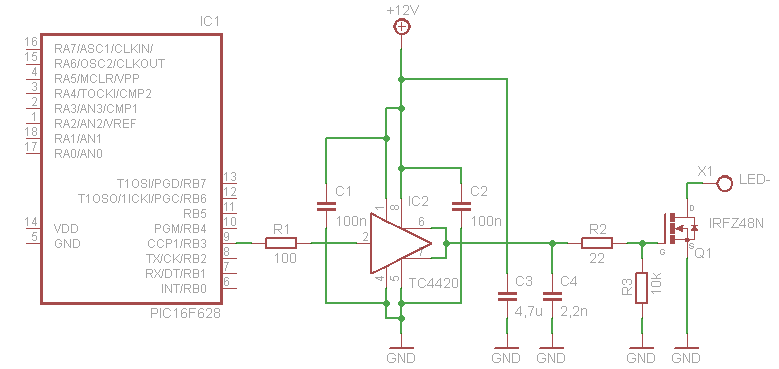 Ez elvieleg jó, de bekapcsolásnál problémás lehet. Sajnos a 628-ban nincs olyan PWM modul, aminek az alapértelmezett kimeneti szintjét be lehetne állítani, de létezik ilyen PIC. Itt lehet, hogy még egy indverter jól jönne, akár egy NPN tranyó is megfelelne az 555 előtt...