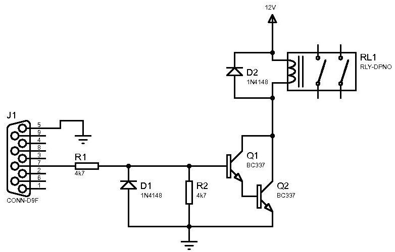 Első körben nem javaslom a mikrovezérlős megoldásokat, mert ha nem tudsz kontrollert programozni, ill. nem fejlesztettél még kontrollerre, akkor szerintem nincs sok értelme, bár igazán szép megoldásokat főként azzal lehet megvalósítani. Helyette egy nagyon egyszerű kapcsolást készítettem, amely kezdetben bőven elegendő lehet. A kapcsolással két független fogyasztót tudsz kapcsolgatni a soros porton keresztül, a modemvezérlő jelek segítségével. A kapcsolás nem teljes, a DB-9 csatlakozó 4-es kimenetére egy ugyanolyan objektumot kell készíteni, mint ami a 7-es kivezetésen van (nekem nem volt kedvem kétszer ugyanazt lerajzolni ).