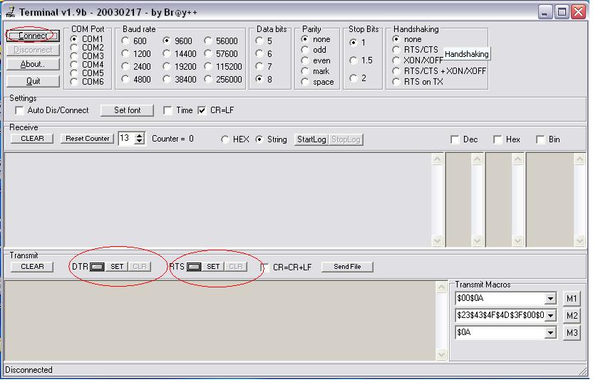 Mivel nem említetted, hogy PC programozásban mennyire vagy jártas, így azt javaslom, hogy először terminál program segítségével vezéreld a portot (Pl.: Bray terminal). A legördülő menüből kiválasztod a megfelelő portot (Pl.: COM1), majd csatlakozol a porthoz (Connect). Az RTS és DTR modemvezérlő jeleket (így a fogyasztókat) pedig a gombok segítségével kapcsolhatod ki-be. Az RTS a 7-es kivezetésre kötött fogyasztót, míg a DTR a 4-es kivezetésre kötött fogyasztót kapcsolgatja.