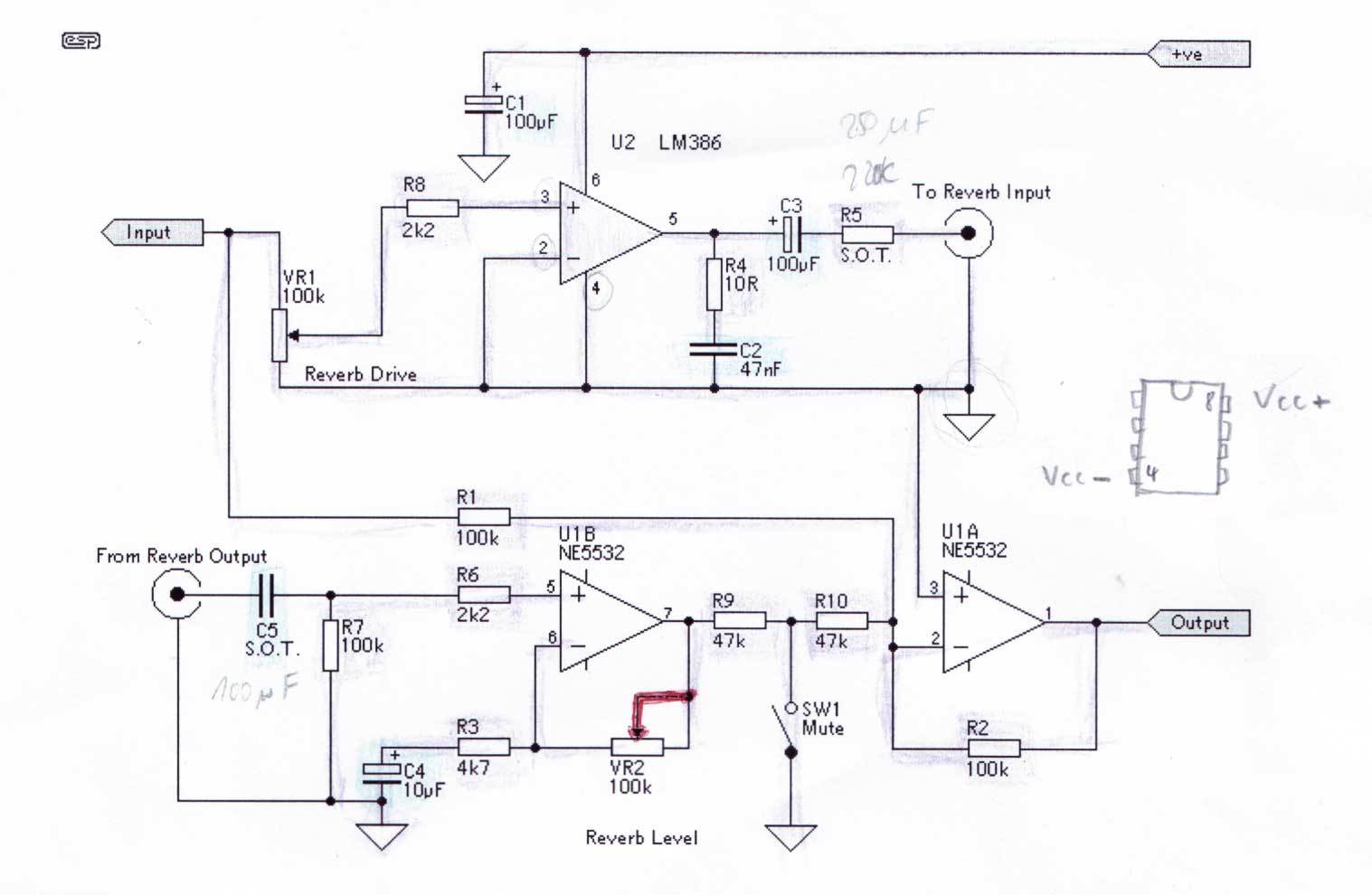 Vigyázzatok a reverb rajzokkal! Azon az oldalon látható és az előző kép csak egy "reverb tank"-(rugós) zengető meghajtó elektronikája! Szóval ez önmagában nem fog működni, mert csak a rugókon keresztül rezeg a hang, az meg nagyon drága multaság!