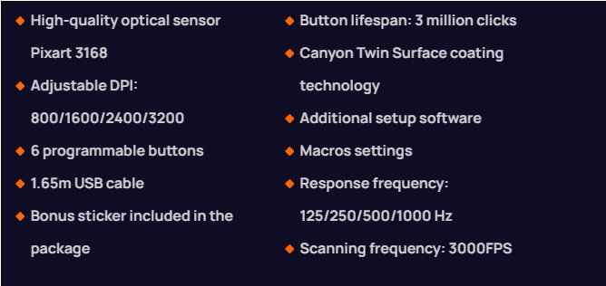 Canyon Star Rider CND-SGM1, 800/1200/1600/2400 dpi, 6 programozható nyomógomb.