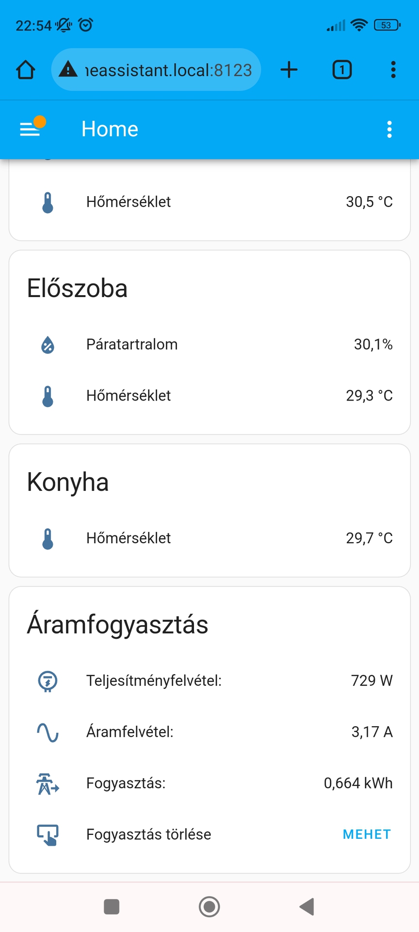 ![]() Közben már beintegráltam HomeAssistantba is. (Jelenleg megy a légkondi, ami takarékba vágta magát.) Egyenlőre még csak mqtt-n keresztül, de elküldhető neki a jelenlegi óra állás is. Meg mqtt-n keresztül törölhető is az aktuális óraállás, ha kell. Szerk: az áramfelvétel csak tájékoztató jellegű, ott mérés nem, csak számolás történik a névleges feszültségből. A hozzászólás módosítva: Júl 9, 2024