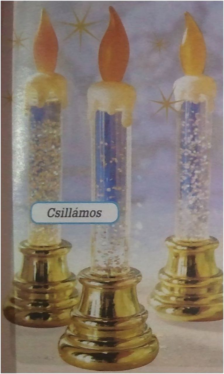 A képen látható gyertyákat kaptam. 3 db LR44 gombelemmel működik összesen 9 db gombelemmel