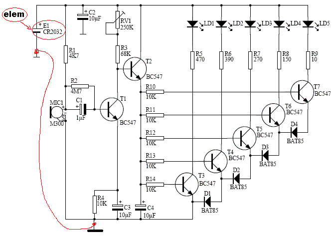 Szerintem ez az ák. 5V-ról fog jól működni (talán egy laposelemről is)...de egy 3V-os CR2032-ről nem. 3V-ról kb 2 Ledig lehet biztosan jó.. A teljes kivezérléshez 6 diódát kell "kinyitni", ez kb. 5x0,6V, plusz a Led nyitófeszültsége kb..1,5-2V. C4-et cseréld ki pl. egy 10K-s ellenállásra. Ahol C3-C4-R4 találkozik az földpont 100%. Üdv!