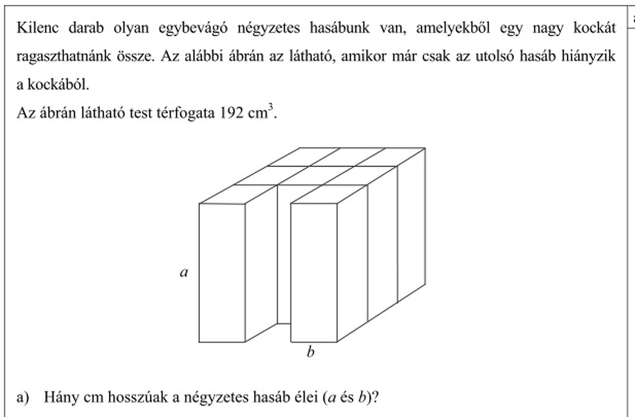 Innen a=6, b=6/3=2 Nem szabad figyelmen kívül hagyni, hogy egy kockát raktak össze ezekből a hasábokból