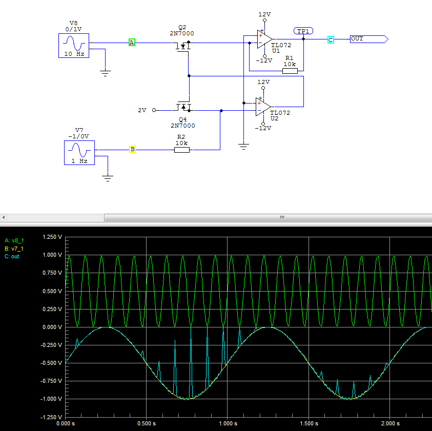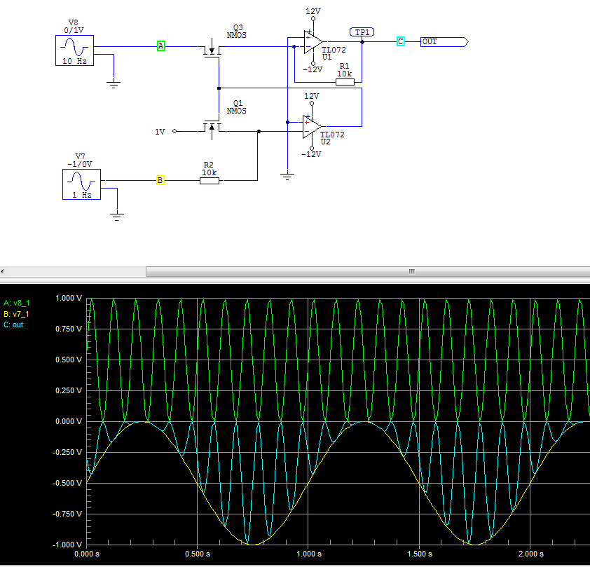 Attól most tekintsünk el, hogy milyen pontosság érhető el, és mennyire pontosan kellene a két FET-et összepárosítani, csak elméletben megvalósítható-e ez diszkrét alkatrészekkel? A mellékelt szimulációban 4 kivezetéses N csatornás MOSFET-tel működik, ahol a substrate nincs összekötve a Source-szal. Ez IC-n belül így is szokott lenni, mert több FET van kialakítva egy substrate-on. (AnalogMultiplier NMOS.PNG) Viszont diszkrét MOSFET esetén még nem láttam olyat, ahol a substrate nincs összekötve a Source-szal. Ha kicserélem a 4 kivezetéses FET-et egy hagyományosra, akkor már nem jó. (AnalogMultiplier 2N7000.PNG) Tudom vannak cél IC-k, például a már nem kapható MC1495 és a még kapható AD633, és ezek ráadásul 4 negyedesek. De most nem ez a kérdés. A hozzászólás módosítva: Nov 18, 2022