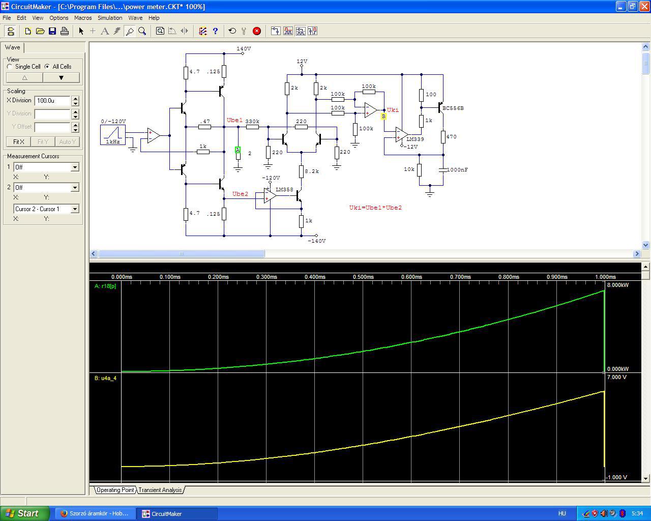 Megnéztem a power meter.CKT-t is. 500uS-nél negyedének kellene lenni a kimenetnek mint 999uS-nél. Viszont a 1,61V és 5,68V jön ki a kimeneten. 5,68V-nak a negyede 1,42V lenne, ami 15% eltérés.