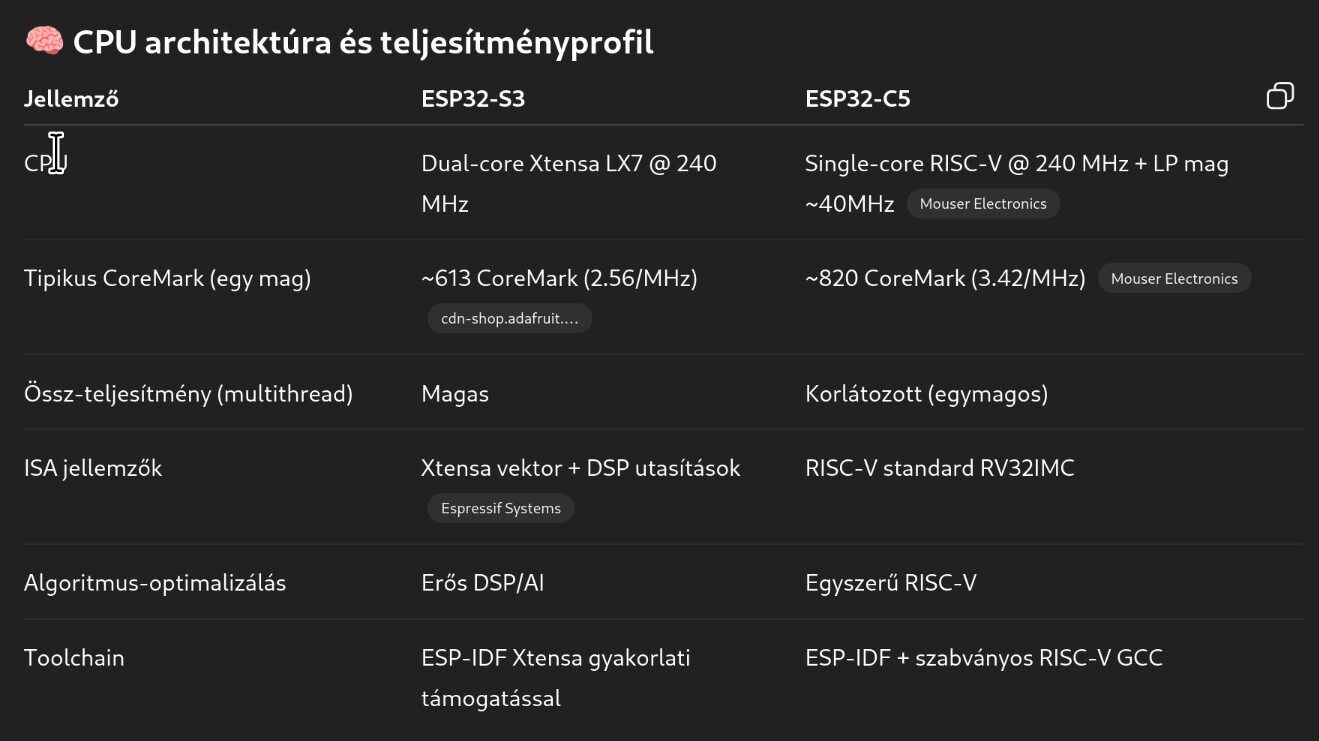Szerintem (számomra) az egyik nagy előny és út a profibb megoldások felé, hogy egy ideje az ESP32 chipek az adott nagy memóriákkal és nyolcszoros SPI kapcsolattal (és cache-en át) alkalmasak elfogadható sebességgel (meglehetősen stabil) TLS kommunikációra egy csomó socketen, ami nem annyira gyakori - nincsenek előttem a pontos értékek, de nagy szám lenne ugyanezt még kisebb fogyasztásból megoldani. (Ezeket saját tapasztalatból tudom, írtam egy nagyobb kódot, egy ilyen távvezérelt I/O eszköz még S2-essel is szépen működik egy ismerősnél a falon magára hagyva, de S3-assal még jobb.) Ugyanakkor az eddig olvasottakból inkább úgy látszik, hogy nincs a második processzor automatikusan kihasználva, ahogy az Xtensával, negyede az órajele, vagyis két mag helyett egyen fut minden, ami elvileg sokat lassít az egészen, hiába gyorsabb az új fő mag egy Xtensa magnál. Tehát lehet, hogy a RISC-V vonal kicsit másra lesz alkalmas - vagy hamar kihoznak újabb változatokat, amik gyorsabbak... Persze a saját írásom helyett inkább másokat kellene olvasgatni a konkrét információkkal, csak léteznek már... : -) A hozzászólás módosítva: Hé, 14:18