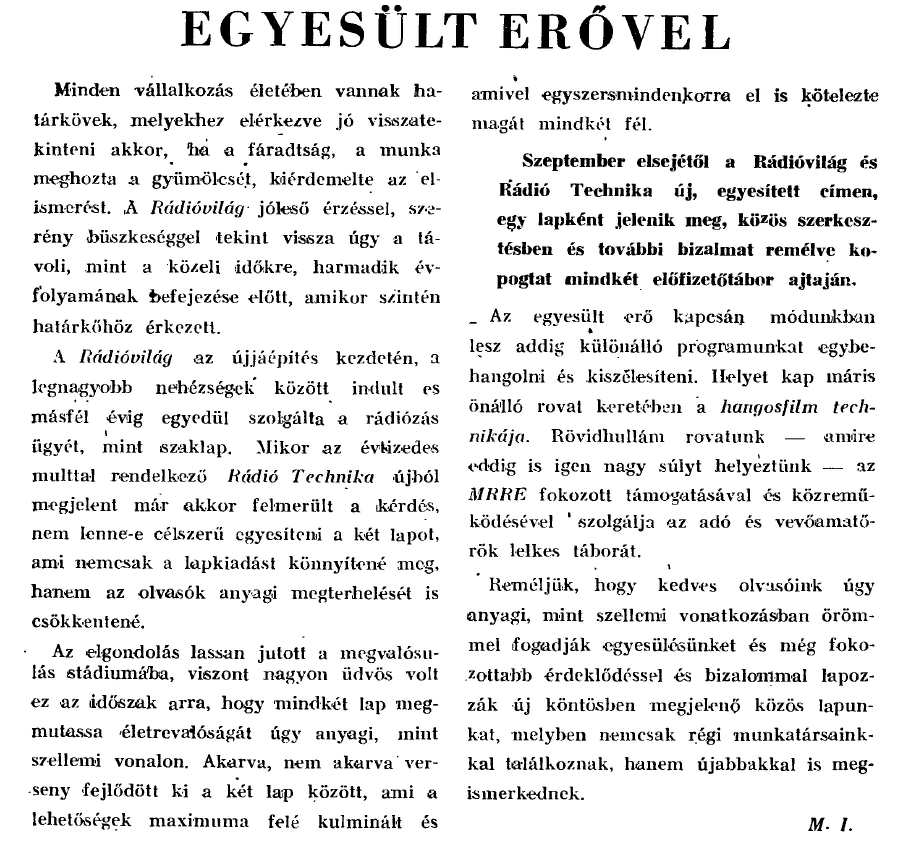 Értem, szóval a Rádióvilág lap nem tekinthető a Rádiótechnika korabeli lapjának. Ez annyiból érdekes, hogy az 1948 szeptemberi Rádió és filmtechnikában van egy sor a belső lapon: