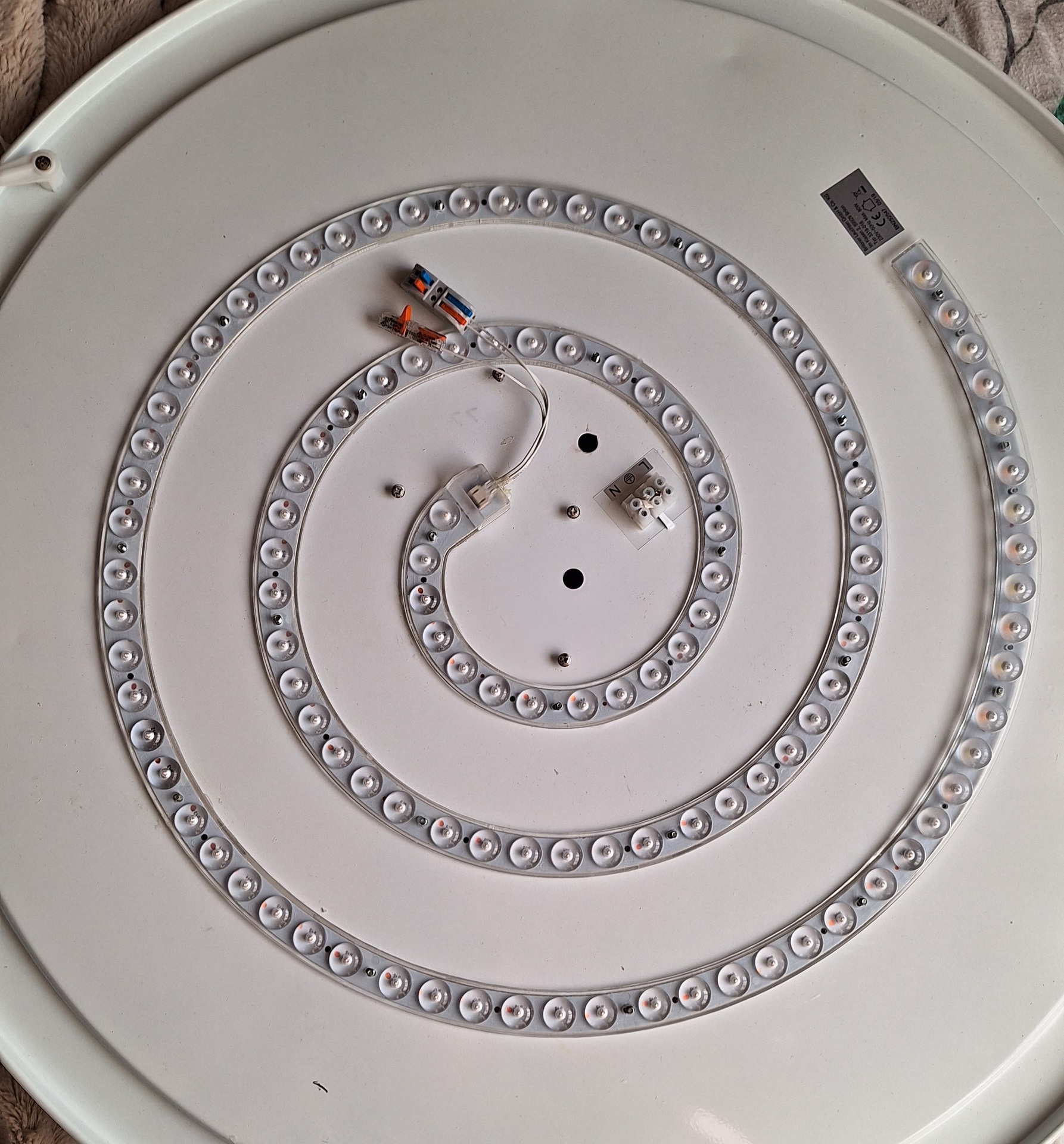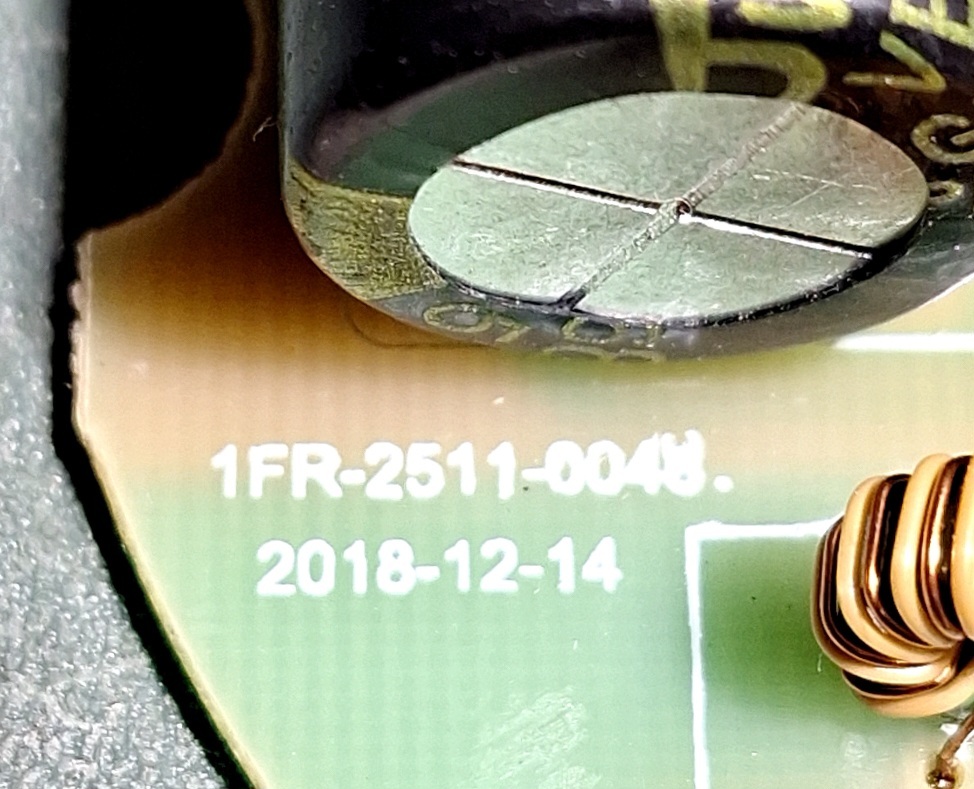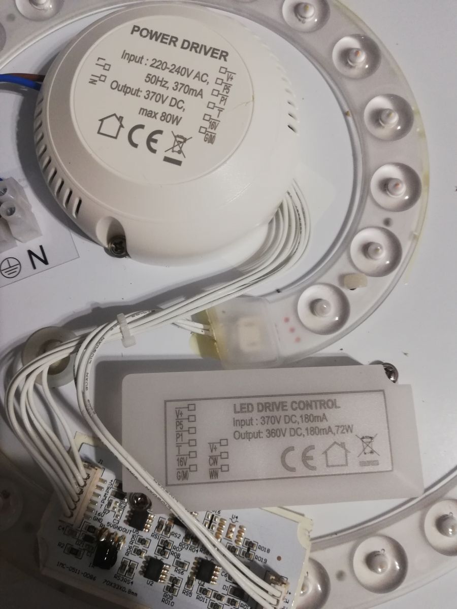 Mutatom a típuscímkét. Az eredeti driver semmilyen adattal nincsen ellátva és távirányítós, 2 részből álló kivitel. A kettő egység vagy 6 érrel kapcsolódik, valószínűleg a távirányító rész döglött meg, mert a driver részen mérek ilyen 520V DC-t. Mivel nem ismerem a kapcsolást, nem tudom szétválasztani a kettőt. Próbaképpen vettem egy aliexpresses drivert, csatoltam róla képet. Ez meghajtja ugyan a 60db ledet, de szerintem kevésbé fényes, mivel a multiméterrel DC állásban csak 320V-ot mérek a kimenetén, ami a ledsorra megy. (plusz ez is távirányítós, bizonytalan működéssel) Ilyenkor a ledeken darabonként olyan 5,2...5,4V-ot mérek multiméterrel. Ezért gondoltam egy sima mezei, atombiztosan működő soros kondenzátoros cuccra, nem kell bizonytalankodó távirányító.