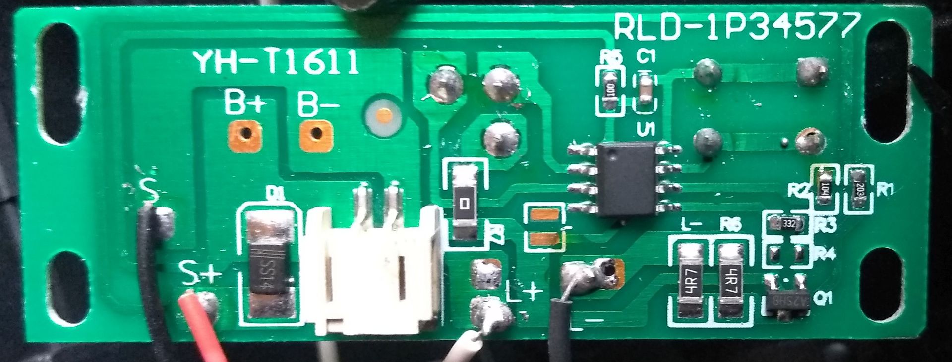 ...és ennyi a töltési elektronika, semmi más extra, semmi védelem! A kínaiak úgy gondolták, hogy napközben a napsütés pont annyi energiát tol az akkuba, amennyit az éjszaka folyamán el is fogyaszt. (Az R5 ellenálláson meg az IC figyeli a napelem feszültségét, ha az lecsökken, bekapcsol a LED). Rendes, tuti jó akkucellát tölts fel külön (kb. 4V-ra) és utána forraszd be a lámpába. Így ellenőrizhető a lámpa helyes működése. "B+B- között 6,3 V - tehát az akkut ̶t̶ö̶l̶t̶i̶ ̶a̶ ̶n̶a̶p̶e̶l̶e̶m̶."...inkább az akku nem veszi fel a töltést, mert hibás (áramméréssel kideríthető).