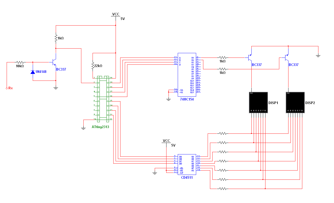 Nem úgy gondoltam! A 7 szegmensesnek 8 lába van, egy az anód vagy katód, a másik 7 pedg az egyes szegmensekhez tartozó lábak! úgy oldanám meg hogy a demux kétszer is uganazt az anódot vezérelje, és a maradék 14 lábat osztanám 2x 7 re, és úgy fűzném fe a dekóderre! Látszólag 2db 7 szegenses de a valóságban 1db 14 szegmenses!