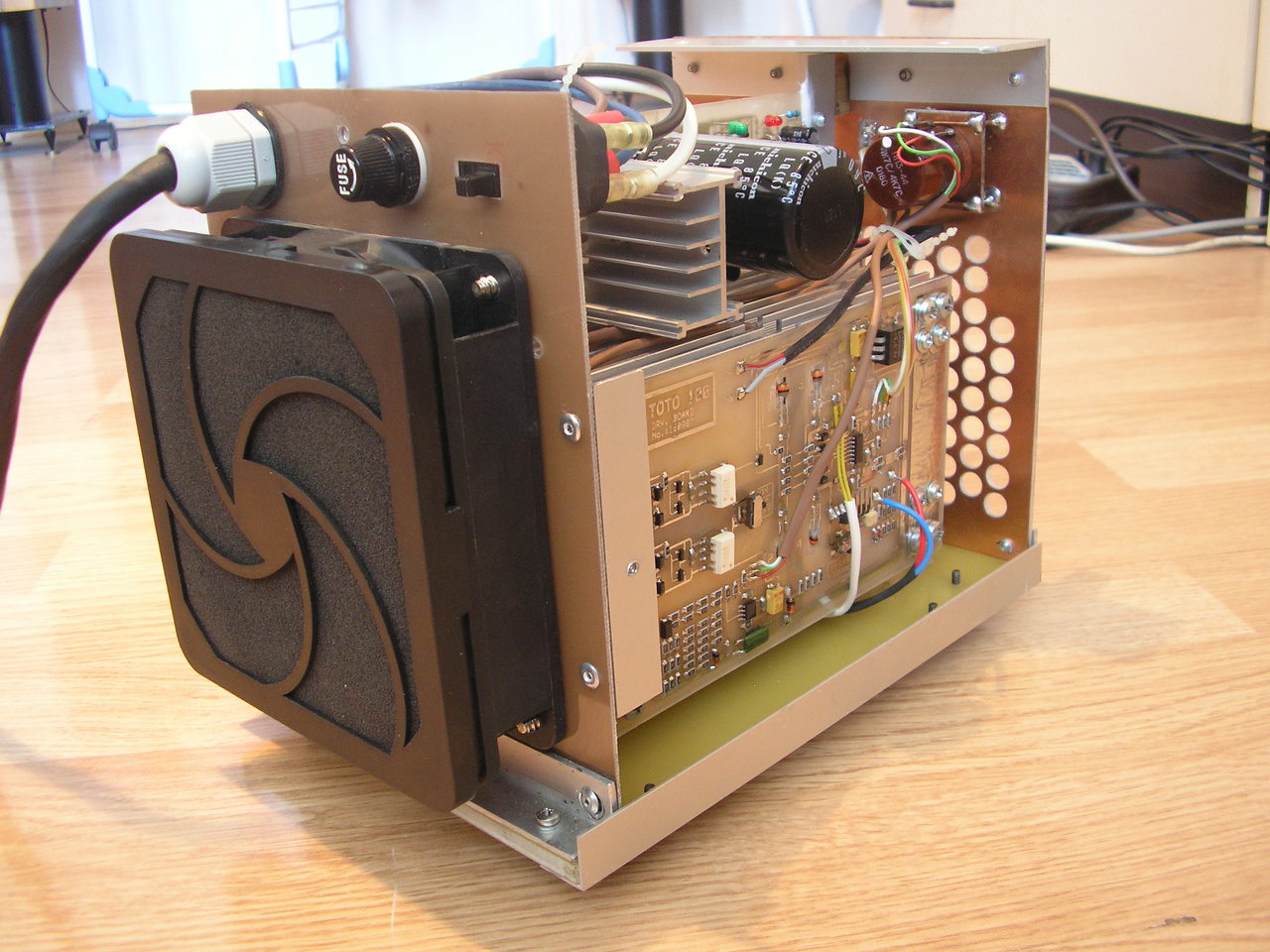 A műanyag ragasztó nem biztos, hogy a legjobb választás, de ez volt. A műgyanta biztos sokkal profibb, viszont itt egy alacsony kihasználtságú amatőr készülék megépítése volt a cél, és abban se voltam biztos, hogy esetleg újra kell tekerni a fojtót, ezért sem akartam agyonlakkozni. A hővédelem 75'C borda és trafó hőmérsékletnél lekapcsol, ezért se hiszem, hogy nagyobb hőmérséklet előfordul, a 120-as ventilátor pedig süvítő szélvihart csinál a készülékben.