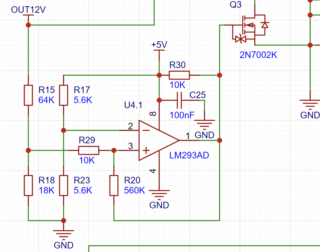 Ez egy alap kapcsolás, ezért nem tartottam fontosnak a képet, de a jobb átláthatóság kedvéért feltöltöm miről is van szó. Nézzétek el nekem hogy a kérdésemben nem ugyan azok az alkatrész megnevezések vannak mint a kapcsoláson. Egyébként ez egy ólom akku védelem lenne. Out12 egyenesen az akksiról jön, a komparátor pedig Q3 fetet vezérli, úgy hogy kb 10,9V-nál lezár, és kb 12V-nál kinyit. Gyanítom R15 és R18-ból álló osztó kavarja meg kicsit a méretezést. Ez a kapcsolás most már úgy néz ki működik, de azért érdekelne hogyan lehet kiszámolni a felső és alsó kapcsolási értéket.