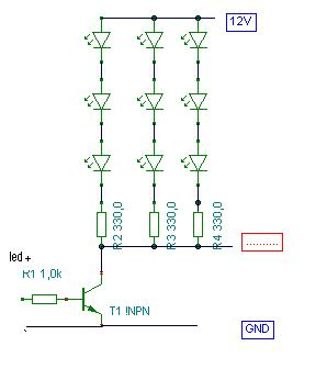 Ha szintenként akarod akkor csak a felső rész kell kiegészítve ledmeghajtó tranzisztorokkal, hogy több ledet lehessen rákötni. Így 12V esetén max 3 ledet tud sorba kötve.Azokból is a nagy fényerejűt javaslom, mert az ic csak pár miliampert tud.