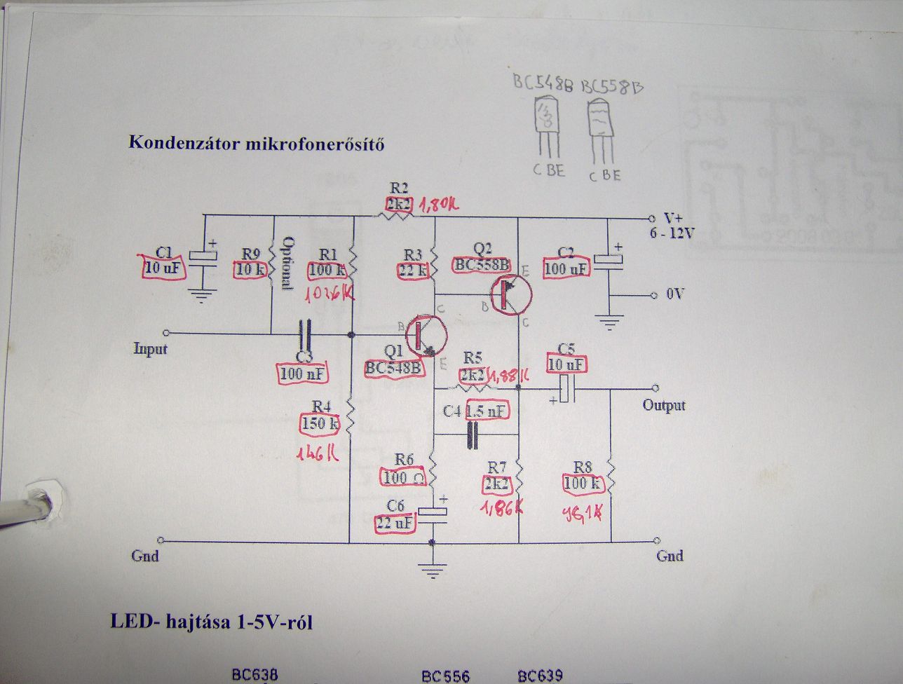 Én ezt építettem meg régebben de ez olyan előerősítést csinál hogy a saját szívemnek a hangját is hallottam vele. A rajz csak fényképezve van meg nekem Ha ezt választod megépítésre akkor a Feketével írt értékeket használd mert amit én odaírtam az az amit én használtam. üdv! UI.: Szerintem ahogy az általad mellékelt rajzon ezelé 3 potit és a mikrofonoka avval tudod állítani..