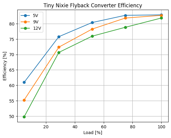 Tiny Nixie Flyback ConverterSziasztok!Készítettem egy galvanikusan izolált flyback tápegységet Nixie óra táplálására. Két kimenete van, az egyik a Nixie csöveket táplálja, a másik a vezérlő és segéd áramköröket. Paraméterei: Bemeneti feszültség tartomány: 4.5 V – 13 V Kimeneti feszültség 1: 170 V (for the Nixie tubes) Kimeneti feszültség 2: 3.3 V (for the control circuitry) Kimeneti áram 1: 20 mA Kimeneti áram 2: 50 mA Maximális kitöltési tényező: 0.85 Kapcsolási frekvencia: 300 kHz 100% DCM üzemmódú Árammód vezérelt slope kompenzáció nélkül Type II kompenzáció Galvanikus leválasztás opto-emulátorral Saját tervezésű és építésű EFD-15 transzformátor Hiccup-mód túláram védelem Lágyindítás Alul feszültség védelem Túlfeszültség védelem Teljesen hangtalan működés A hatásfoka 100%-os terhelés mellett minden bemeneti feszültség tartományon kb 82%. Csatoltam diagramot a hatásfok görbékről, valamint néhány mérésről, mint pl. a drain és gate elektródák feszültsége, és a tápegység elindulásának folyamata. A projekt GitHubon is fent van: https://github.com/slimcolt/Tiny-Nixie-Flyback-Converter A hozzászólás módosítva: Kedd, 20:38