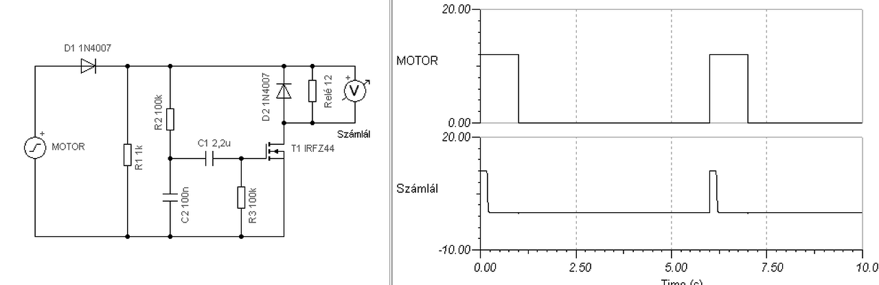Hello! Bár ez nem astabil feladat, inkább bistabil. De néhány alkatrésszel egy Fet-el megoldható. (A "relé", maga a számláló tekercse. A műszer rajta csak a szimuláció miatt van.)