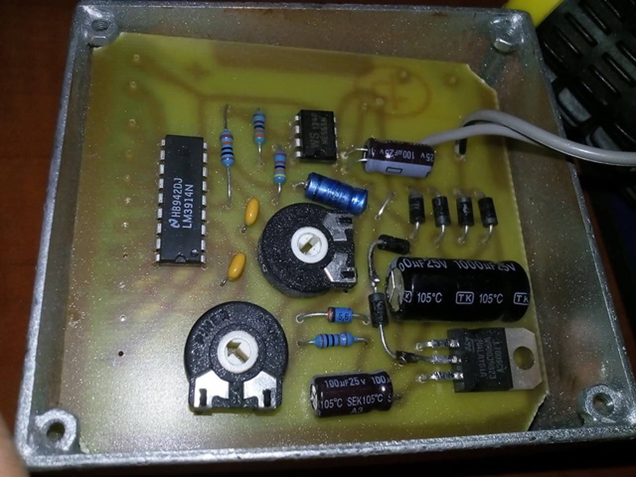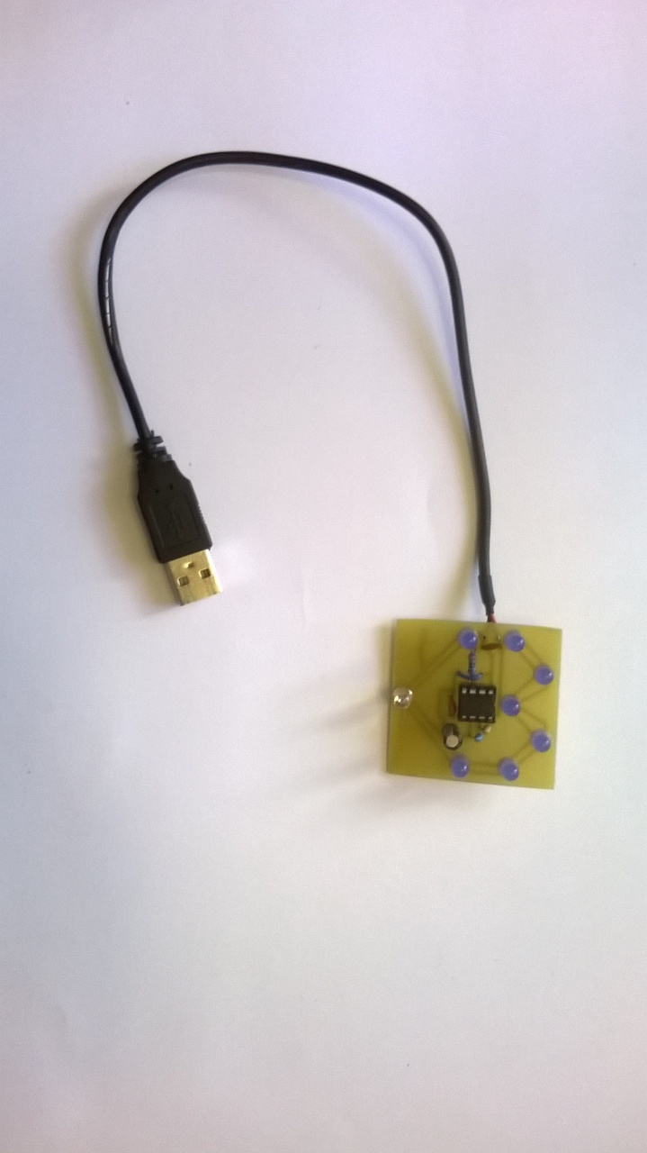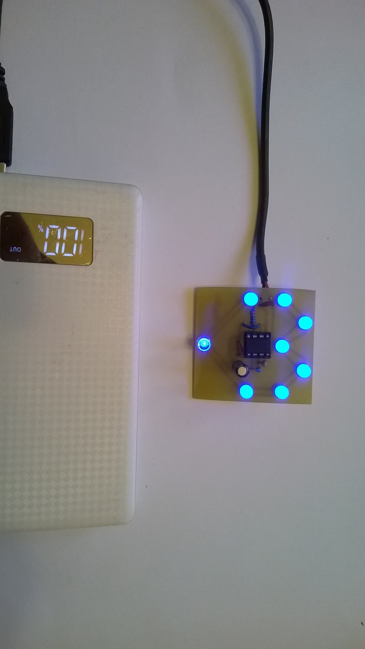 Az egész kb 8×8cm, 3,5cm széles nyákból készült dobozban van. Táp nincs benne, adapterről megy. PL VLC Playerben lassítva lejátszva láthatod a LED csoportokat, ahogy kigyúlnak.