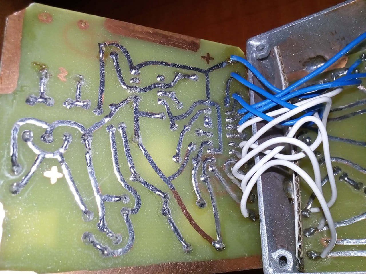 Nem fém. Nyák lemezből van. Belül a réz a sarkokban összeforrasztva, kívül a sarkok lecsiszolva, keréktárcsa ezüsttel lefújva. (már kicsit ütött-kopott) Az M3-as anyák is forrasztva vannak a sarkokban, amik a hátlapot fogják. Hát pontosan nem emlékszem, de nem hiszem, hogy lombfűrésszel csináltam, már rég volt. Úgy rémlik kis nyákfúróval (0,8-1mm) fúrtam sok lyukat egymás mellé és oldalra mozgatva összeértek a lyukat, csak ott hagytam meg egy kis darabot, ahol kiesett volna a közepe. Az első nyák a LED-ekkel is hozzá van forrasztva a doboz oldalához, azt azért nem fényképeztem most.