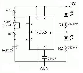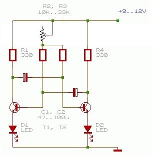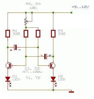 Tudok erről a kapcsollásról: http://www.hobbi-elektronika.hu/forum/topic_681.html de itt a sebesség nem állítható! Én megépítettem egy kapcsolást (lásd mellékelt kép) de itt az egyik LED alig villog, a másik pedig csak "félig" alszik ki, bár ez szabályozható. Nézegettem a neten sok oldalt de olyan kapcsolást ami nekem megfelelne nem találtam!