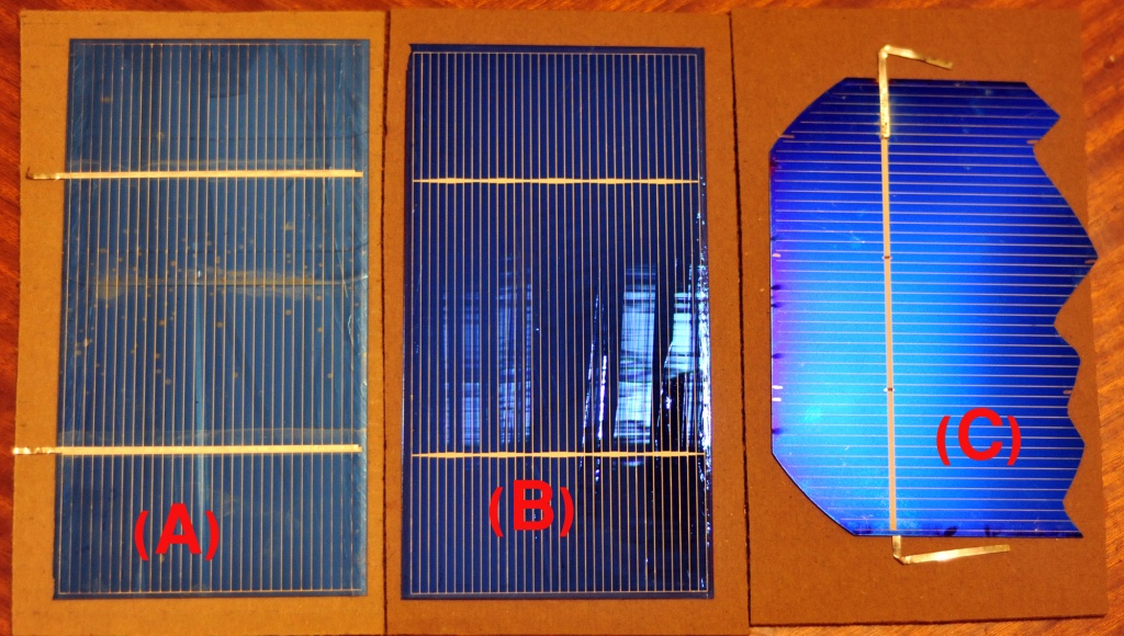 Ránézésre lenne jó megtudni most akkor milyen fajták ezek. Polikristályosnak mondanám, de monora is hasonlít sőt megvan folyva rajtuk a kék bevonat... Csináltam fotókat, amin jelültem betüvel melyik milyen szállítmányból jött. Az (A) jelűeket kaptam elsőnek, azok nagyon matt felületűek, az (A1) jelzésű nekem egyértelműen polikristályra utal de az (A2) pedig a monora hasonlít viszont ha hozzáérek kézzel a matt kék felület helyett olajfolt szerű barna matt réteg lesz rajta és le sem mosható fura módon.... A (B) jelűeket kaptam most, ezek nagyon csillognak mitn atükör ezeket sem tudom most poli vagy mono lenne vagy mi mert ennyire csillogó fényeset még nem láttam. 9-et sorba kötöttem, 5voltot adtak így le a várt 4,5 volt helyet és nem esett lejjebb az 5Volt akkro sem amikor a PSP-met arról használtam (kb. 250mA-t vesz fel átlag, a cellák névlegesen 3,6amperesek de ennek a felét sem hiszem el). Jól tűrték a részleges árnyékot is. Amit (C)-vel jelöltem az egy törött minőségi mono cella összehasonlítás végett, láthatóan egyenletes nem megfolyó és lilás felületű. Ebből adódóan az (A) talán mégis poli lehet csak megfolyt és gyatra a minősége?