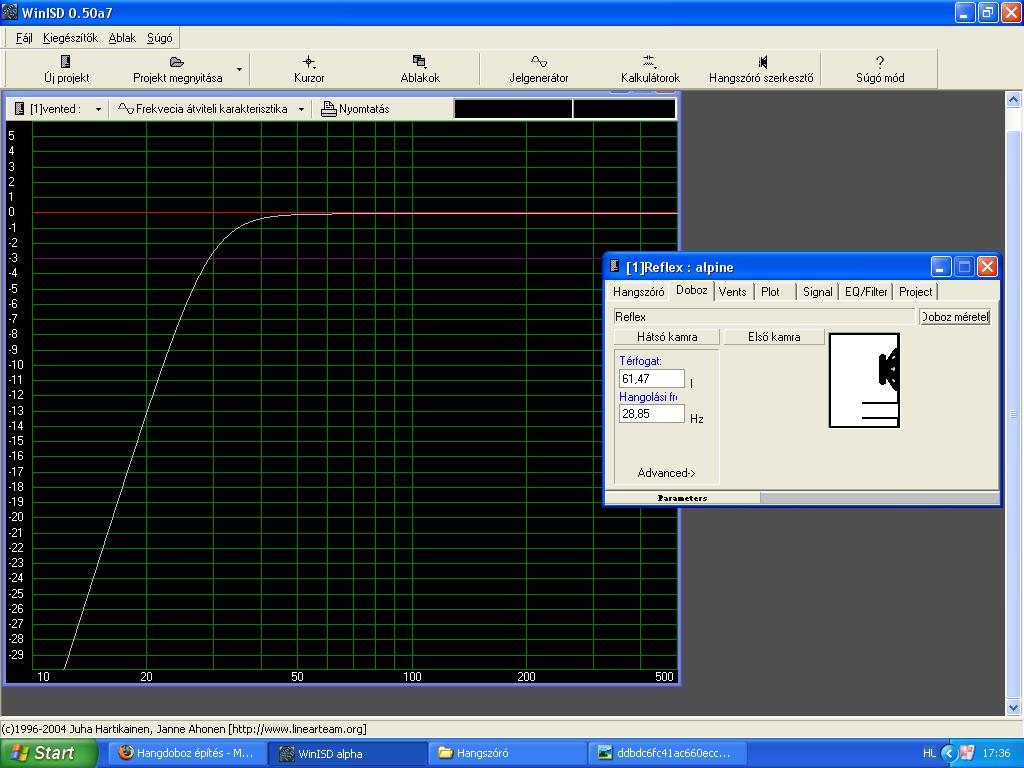 Akadt egy kis időm, úgyhogy megnéztem a hangszórókat. Directors: nem könnyű eset a hangszóród, tényleg olyan batár doboz kéne neki, de az hülyeség... találtam egy variációt, én azt javasolnám. A te csatolt fájlodban van két fájl. A wdr-t másold a drivers könyvtárba, a wpr-t meg ahova akarod, aztán azt nyisd meg. Nem mondható épp tökéletesnek a karakterisztika, de nem tudtam jobbat kihozni belőle. Inkább 2db SA1315-öt rakj hozzá párh-ba, akkor azok 4Ohm-osak lesznek plusz 2x akkora teljesítményűek. És ha megteheted, javaslom, hogy a magasat is cseréld ki, valamilyen dóm-ra. Sokkal szebb hangjuk van mint a piezonak. Az ADT12-t vagy az XPRO25AL-t ajánlanám. Az utóbbi autóba való, de egy kis ügyességgel szépen integrálható szobai dobozba Hangváltóból pedig a HV623-ast ajánlom.Ha akarod csinálhatok 1-2 doboztervet. Gery: a te hangszóród nem tűnik rossz választásnak, de csak reflex-be érdemes gondolkodni. Neked is töltöttem fel terveket, nézd meg őket. 3 bandpass és egy sima reflex van köztük. Én valamelyik bandpass-t választanám, attól függően, hogy mennyi hely van a csomiba. Viszont a 2 mélyebbre húzott bp-t EQ-val korrigálni kell, majd vedd ki a jelölést és nézd meg milyen úgy... Ha van kérdés, várom. Minden jót!