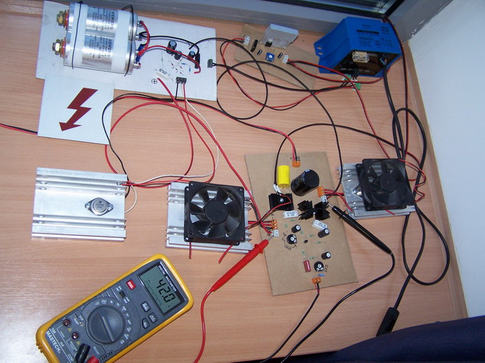 Elkészítettem az áramkorlátos fesz. stabilizátort annyi külömbséggel, hogy a 4700µF helyett 200000 van. Rákötöttem az erősítőre. Hagytam a 2N3055-öket. Szépen beállítottam a fél feszt. Az áramot némi izgulás és para után sikerült belőni 1,56A-ra. A kapcsolási rajzba én módosítanám P2 értékét 50kOhmra, vagy ha már 100, akkor meg két 50k-s potit raknék sorba, hogy ne legyen olyan érzékeny a rendszer a csavarásra egy ponton. Az erősítőn 42,7V-ot mérek és amint írtam 1.56A-vesz fel. A tranzisztorok valóban rendesen fűtenének, de a ventillátoros hűtés ezt szépen kompenzálja. Az új tápon lévő 2N3055-nek nincs ventillátora, de nem is melegszik annyira, de hosszú távon nagyobb hűtőre fogom rakni, mert azért érezhetően fűt az is és még nem volt időm sokáig járatni a rendszert.