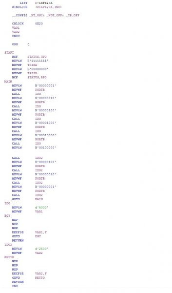 Köszi a tippeket, amúgy valószínű, hogy a progival volt baj, mert egy másik futófény progival, világítottak a ledek csak gyorsan, most itt van a probléma... 8 ledes futófény programban hiába íróm árt a várakozást kb már tízszeres várakozásra írtam át mint eredetileg de még így sem lassul... ha mozgatom a szemeimet látom hogy ide oda fut a fény... amúgy a táprésznél stabilizálva van, azért felteszem... csináltam egy gyenge minőségű fotót a szerkezetről... a programról a képet painttal raktam össze szal hiányzik a közepéről pár sor de az lényegtelen...