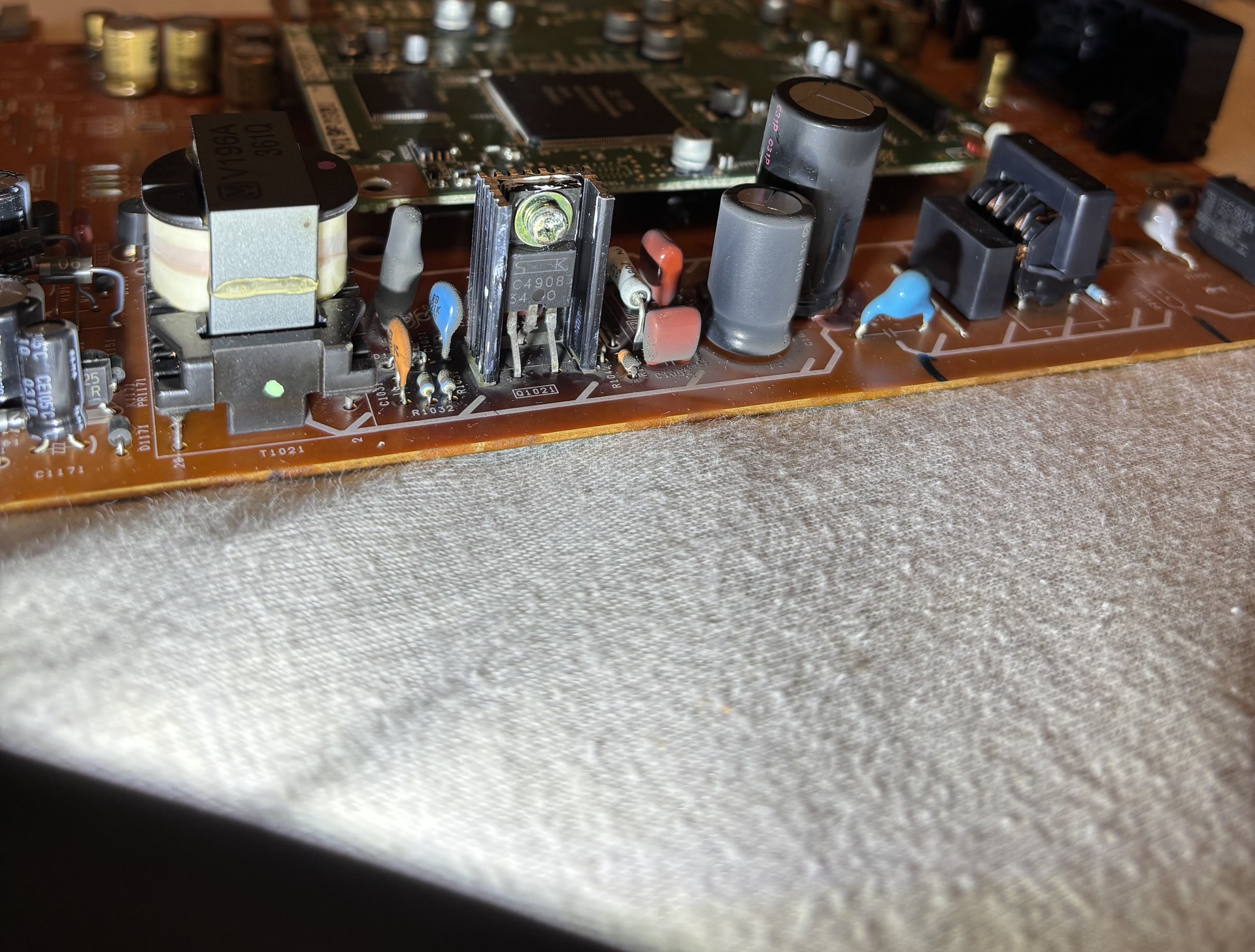 Nem melegedtek túl, csak a nyáklap barnult meg jobban a melegedéstől. Ha nem kapcsol be a készülék és a biztosíték is jó, akkor az elektrolitkondenzátorokat kell ellenőrizni, cserélni. Nem árt a forrasztásokat is átnézni.