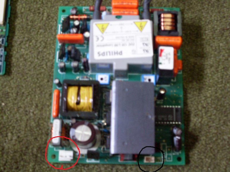 Hátha így jobban látod: a fő vezérlő panelről jön egy vastagabb kéteres kábel (pirossal karikáztam)egy kondi (?)szerűséghez majd továbbmegy az alsó panelra-mellé van írva a lamp felirat.A fő panelről jön még egy vékonyabb 3 eres kábel (feketével karikáztam) a hátsó panelra.Egyéb nincs.Ha így se sikerülne esetleg telefonos v. skype elérhetőségen is konzultálhatnánk.