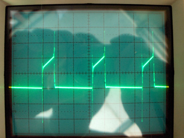 Tehát, ez egy áramváltó. A primere 1 menet, ezt át kell fűzni a ferritgyűrűn, a szekunder meg legyen mondjuk 30 menet. Így a szekunderen nagyjából a 30-ad része folyik a primeráramnak. Ebből következik, hogy ha a drain-en 12 A folyik, akkor a szekunderen 0,4 A. Ha 1 V kell az ic áramérzékelő bemenetére, akkor oda 1/0,4 értékű, azaz 2,5 ohmos ellenállás kell lezárásnak. Gergő rajzán ez a schottky utáni ellenállás, ami az 5-ös pontra megy. Ebből az is látszik, hogy viszonylag még így is nagy a veszteség, mert 0,4 A elég nagy áram. ( 0,4 W lesz ) Ahhoz, hogy ez csökkenjen, kisebb áram kell a szekunderen, vagyis nagyobb menetszám. Nyilván a schottky dióda feszültségesése beleszól a kimeneti feszültségbe, tehát ezt az ellenállást kisérletezgetéssel kell megállapítani. Ez a bekapcsolás alatt, az áramjel előállítása. A visszamágnesezést a maradék ellenállás, zener, meg adióda végzi. ( ez utóbbi nem kell, megy anélkül is ) Amikor a FET kikapcsol, akkor megszűnik a drain áram, a vasmag fel van mágnesezve és ez a mágneses energia valahol le akar épülni. Megfordul a feszültség iránya a szekunderen és addig nő, míg valahogyan áram fog tudni folyni, vagyis megnyit a dióda, meg a zener és a feszültségükön rögzítik a szekunder tekercs feszültségét. Ez a feszültség kb 13 V, tehát sokkal kevesebb idő szükséges a visszamágnesezéshez, - vagyis az ugyanakkora feszültség-idő terület eléréséhez, mint a bekapcsoláskor ( felmágnesezéskor ) Látszólag ez az elrendezés olyan, mintha egyenáramot vinne át az áramváltó, de azért azt tudni kell, hogy csak az ilyen impulzus áramokra igaz, tehát egy felmágnesezés után ( ami lehet akár többször egymás után is ) kell biztosítani a vasnak a lemágnesezést is, különben betelít. Ebből következik, hogy pl. a kimeneti fojtóval nem kötheted sorba, mert ott tiszta egyenáram folyik ( némi hullámossággal ) A drain körbe azért célszerű kötni, mert a FET árama biztosan megszűnik és zérus lesz. ( azért lesz egy kis túlfeszültség a drain-en, hiszen be lett építve egy kis szórási induktivitás a körbe ) Az is látszik, hogy akármekkora kitöltésre nem használható, mert ha nagyon csökken a FET kikapcsolt helyzetű ideje, akkor már egyre nagyobb feszültség kell a visszamágnesezés alatt az ugyanakkora feszültség-idő terület eléréséhez, tehát, egyre nagyobb feszültségű zener kell bele. A ferrit anyaga nem kritikus, de azért ne az antennáknál használt ballun trafóból csináld, mert az nagyon kicsi indukciót tud elviselni. Végül is beteheted a source körébe, de az a baj, hogy akkor az áramváltón át fog látszani a gate töltő/kisütő árama is. Aztán ezt vagy megeszi eléggé a végére kötött RC, vagy nem. Próbáld ki. Nyilván, csak akkor kösd be a sönt helyére ezt a feszültséget, ha a szkópon megmérve ugyanazt látod. A szkóphoz: amit belinkeltél fotót, azon az látszik, hogy van nagyon sok keskeny impulzus, meg egy majdnem normális a közepe táján. Ha ezt az impulzust akarod megnézni, akkor kell használni a kettős időalapból a "B" időalapot. A szkópon a "B" időalap indítását tedd autóba, nyomd be az "A itten" kapcsolót. Az "A" időalap fogja meghatározni, hogy milyen hosszú sorozatot látsz az ernyőn, legyen az előbbi ábra. A "B" időalap kapcsoló a Time/Div kapcsolón legyen kisebb időosztásba állítva ( ha jól emlékszem, úgy tudod tekergetni, hogy kihúzod egy picit és akkor a "B" időalapot változtatod. Ezzel egy másik fűrészgenerátor fog menni a szkópon belül, a helyét látod a képernyőn, mert az a szakasz világosabb lesz. A helyét tudod változtatni azzal a nagy fényes gommbbal, amit vagy tízszer meg lehet tekerni. Ezzel állítsd be, hogy az egész impulzus világosabban látszódjon. Így kijelölted azt az időszakaszt, amire kiváncsi vagy közelebbről. Most nyomd be a B'dly gombot, ekkor csak a korábban kivilágosított időszakasz fog látszódni a képernyő, tehát, meg tudsz nézni egy ilyen össze-vissza, de periódikus jelben egy részt, míg e nélkül nem biztos, hogy tudsz erre az impulzusra szinkronizálni. Ha a "Mix" gombot nyomod be, akkor a kivilágosítás kezdetétől rajzol a szkóp, de úgy, hogy a kivilágosítás előtt még az "A" időalap megy, utánna meg a "B" időalap, tehát egyszerre látod mindkettőt az ernyőn. ( Mixelt, vagy kevert üzemmód ) A helyzetét az előbbi nagy gombbal ugyanúgy tudod állítani. Lehet ezt az egészet még fűszerezni azzal, ha nem autó állásban vannak a fűrészek indítóáramkörei, mert akkor csak egy adott feszültségszinttől indul a folyamat. Ezekre már magadtól is rájössz. Az a helyzet, hogy nem találtam a szkópról egy olyan fotót, ahol minden felirat jól látszik, ezért csak az emlékeimre hagyatkozva írtam ezeket. Ha nagyon nem akar menni a dolog, akkor tegyél fel a szkóp előlapjáról egy nagyobb fotót, ahol minden felirat jól látszik, aztán majd kitaláljuk.
