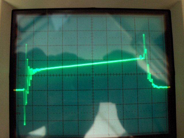 Ha igen, akkor: A jel tetőesetét (valószínűleg) az okozza, hogy a zöld toroidod kis permeabilitású, kis AL értékű porvasmag. (esetleg zöld-kék??, vagy zöld-sárga?? mert akkor biztos porvas.) Mindenképp ferritet használj, legalább AL>1000 értékkel. A mágnesezőáram az impulzus alatt folyamatosan nő, és levonódik a primer áramból, ezért elhanyagolhatóan kis értéken kell tartani, különben tetőeséses lesz a kimenő jel, ezért kell a nagy AL, permeabilitás. A nagy tüske okát a tegnap leírtak között keresd. Valószínű a szórt induktivitások szerepe, mert azonnal van negatív túllövés is. A söntöd is erősen induktív, ilyen helyre lemezből kivágott "kígyót" szoktak használni ellenállásnak. A gate-töltő-kisütő árama is megjelenik a source-hoz kötött söntön, ezért a 100A szerintem mérési hiba. Ha nem, ellenőrizd, hogy honnan jön. (lassú a dióda? nem schottky?). Szerintem ha kb 500ns/cm eltérítéssel nézed, a tüske egy gyorsan csillapodó szinuszos jellegű több MHz-es rezgés, (ha jól sejtem). A szórt induktivitások, és a tekercselési és egyéb (dióda) kapacitások alkotnak kis jóságú rezgőkört. A lehető legkisebb áramhurkokra törekedj. Snubber ezen ront, csak a zavarkibocsátás csökkentésére való,és a csillapítást növeli, az első csúcsot nem csökkenti, sőt. Túllövések ellen az első a jó nyákterv. Az áramváltó ha nagy permeabilitású, és nem telít be, akkor 1-2%- os hibával több MHz-ig pontos, alakhű és nem ijed meg a tüskéktől.