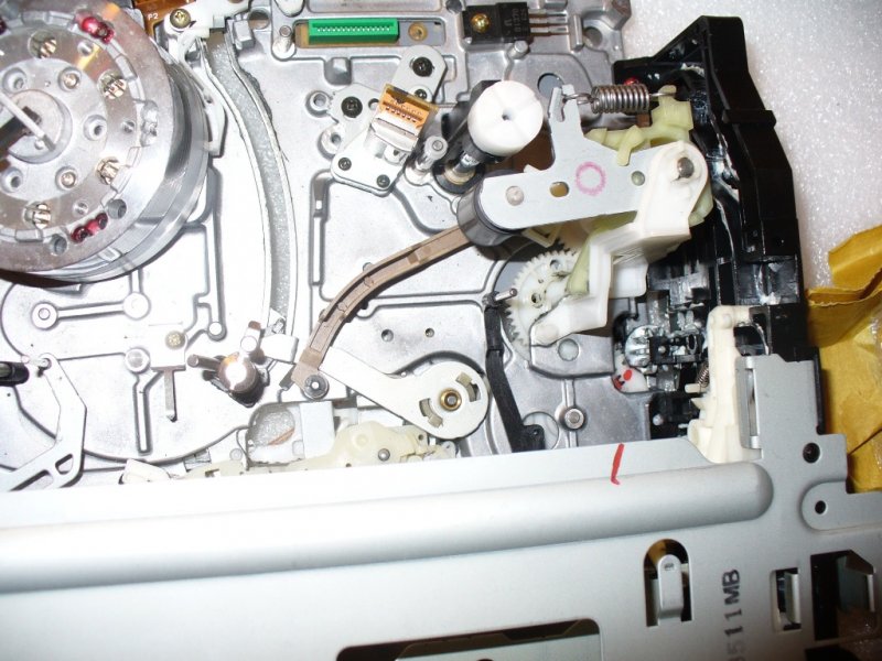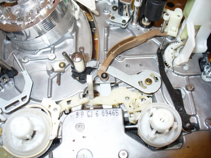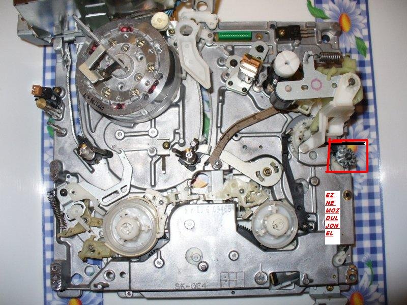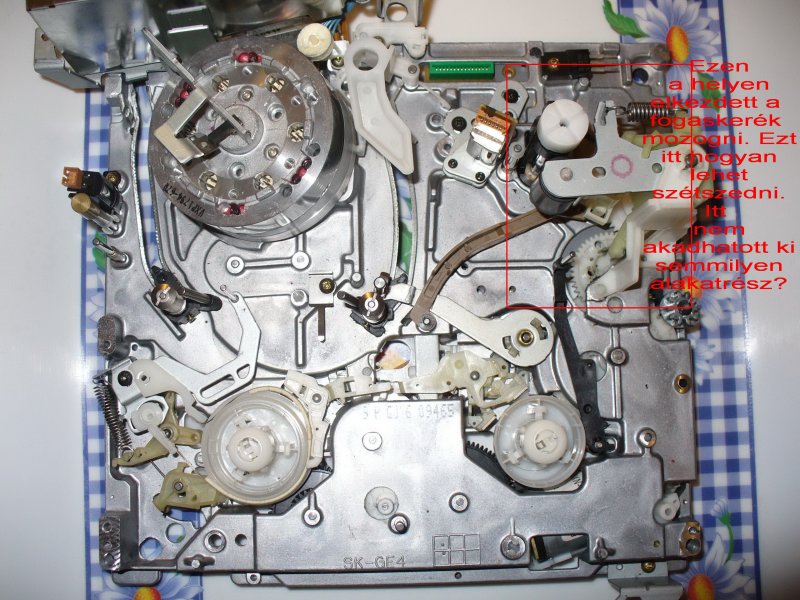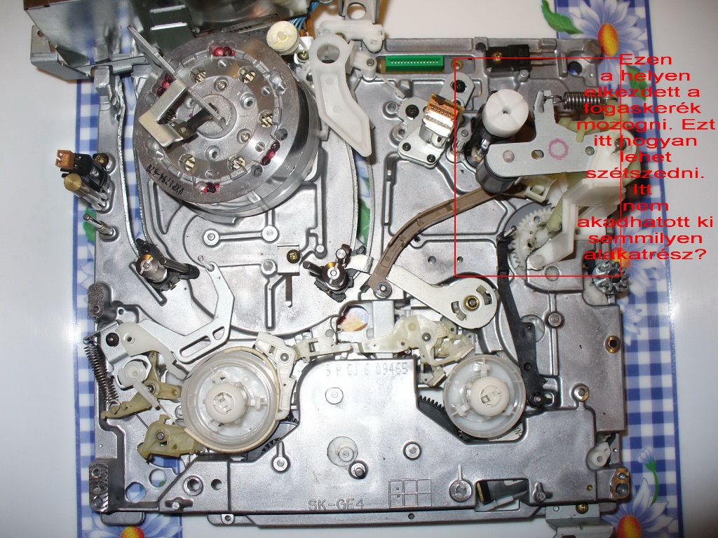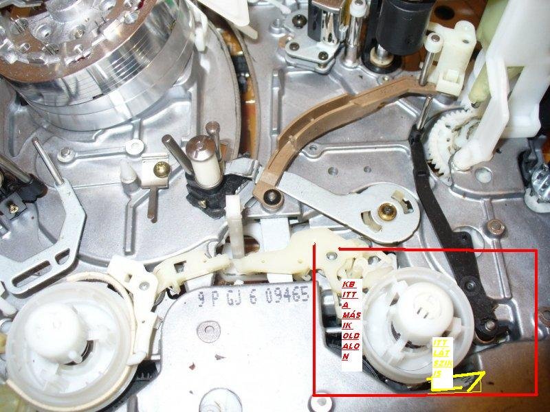 Ha figyelmesebben olvastál volna kevesebb problémánk lenne. Feleslegesen bontottál meg dolgokat, ezzel csináltál néhány műhibát. Kértelek, addig ne folytasd, míg a fészek pozícióját nem tetted az eredeti helyzetbe. Ennek megoldása nem lett volna akkora probléma, ha megbeszéljük.., mivel tovább bontottad a mechanikát, így nehezítetted a javítást . Kérlek olvass vissza figyelmesebben, lépésről lépésre mindent leírtam. Ha valami nem érthető, kérdezz mielőtt bontasz. Amíg a kazetta behelyezése nem működik, addig nem szabad más hibát keresni. A képen lévő alkarészek közül , csak a fém fogaskerékre figyelj, annak és a kazetta fészek bal szélén lévő fogasléc helyzetét kell megfelelő pozícióba hozni, figyelni a jelöléseket!. Ha nem érthető , kérdezz!