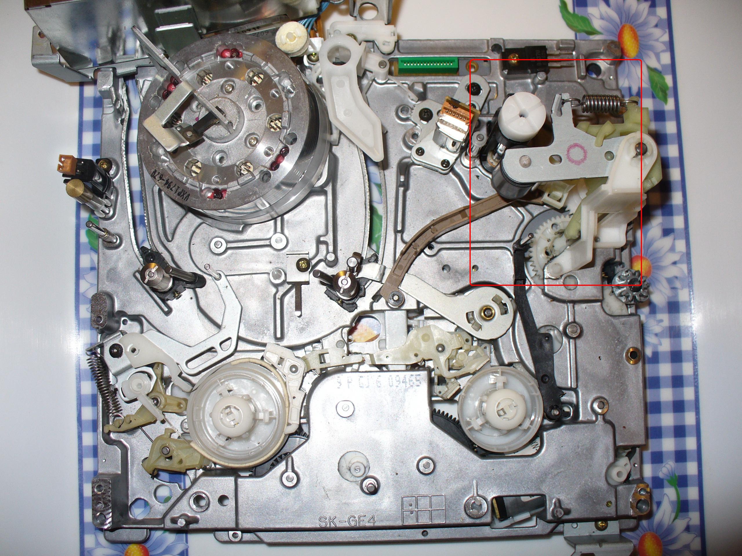 Felfűztem manuálisan a szalagot, valóban a szalag befűzésekor probléma van. Egy hasonló panasonic video sd20 mechanikáját (k mechanic) megnézve tapasztaltam a hibát. Sajnos nem a pulley a hibás, kipróbáltam másik motorral is. A hiba azon a helyen van (amihez szét kell szedni az egész mechanikát), amit múltkor bejelöltem. Valahol átugorhatott a fogaskerék és emiatt szorul valami.