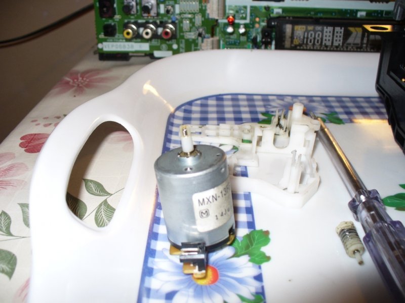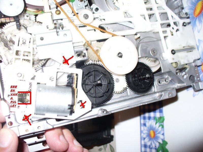 Majd az 1 képen bejelölt motort szereld ki és megtalálod a keresett alkatrészt a csiga belsejében, ha repedt akkor valóban az volt rossz. Addig ne rakd vissza a motort, míg a fészek beállítását nem ellenőrizted. Motor nélkül kazetta be és a megjelölt fogaskerék (3 kép) kézzel forgatva beveszi a kazettát, majd vissza tekerve ki , ha minden ok , akkor csináljuk tovább.