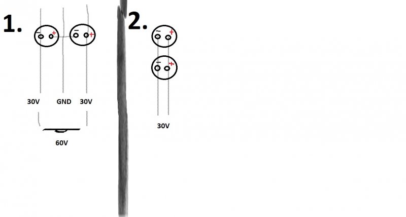Szia. Ha csak egy 30v-os fesz van akkor a 2-es képet használd!