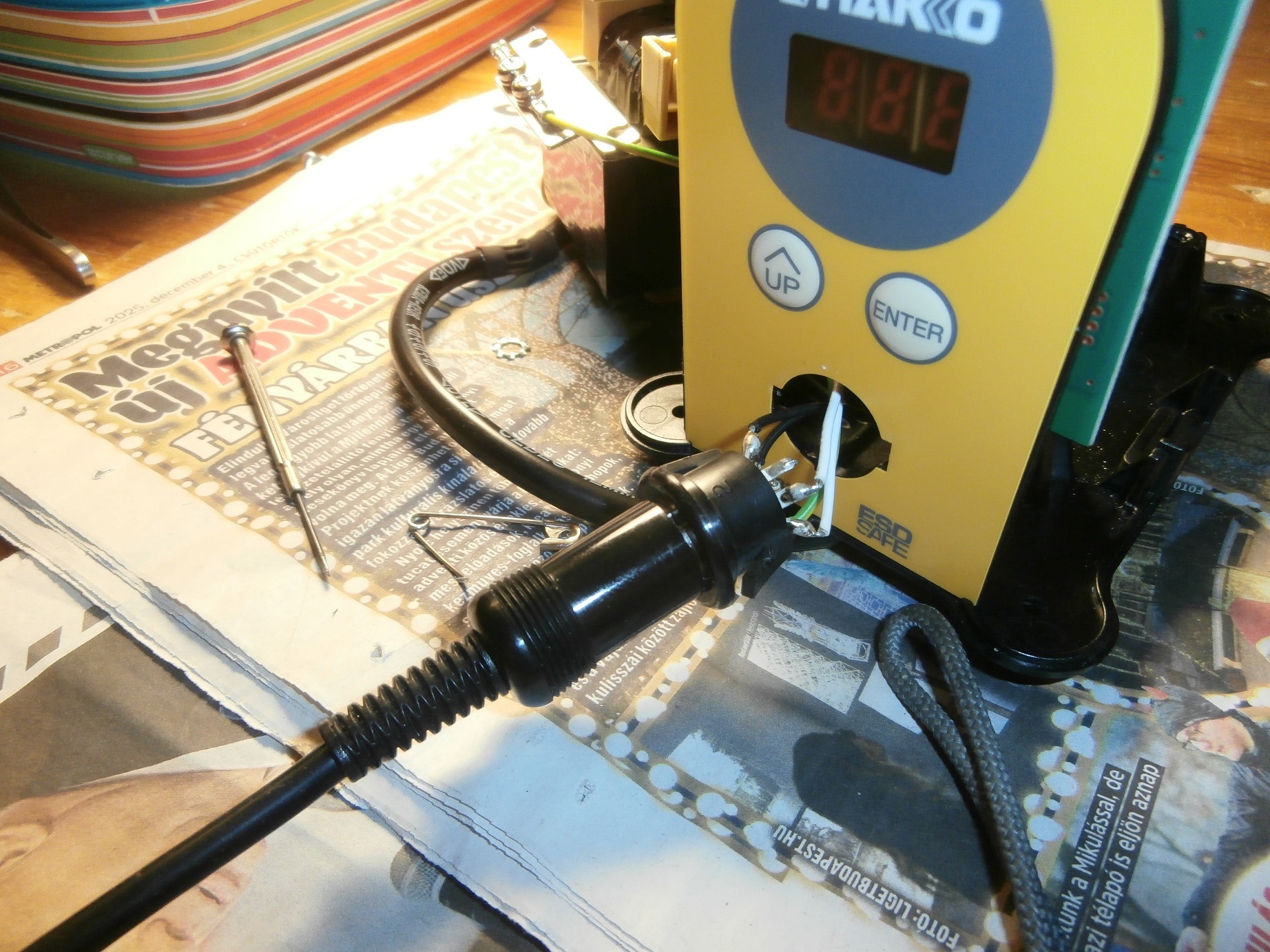 Idézet: „„A Hakko FX-888D egy digitális forrasztóállomás, amelyet a Hakko Corporation, a forrasztóberendezések vezető gyártója gyárt. Népszerű eszköz a hobbi barkácsolók, a barkácsolók és a profi technikusok körében a kiváló minőségű konstrukció, a felhasználóbarát kezelőfelület és a fejlett funkciók miatt.”” Nos egy ilyenre a fiam beszélt rá, és ez fontos kelléke lett a hibrid fejhallgató erősítőm elkészítésének úgy 1 éve. nagyon örültem is neki, mivel rég volt ilyen minőségű pákám. Azonban, most a munka dandárjában megsértődött, és előbb alkalmilag, nem rég meg stabilan felmondta a szolgálatot. Nem akart rendesen fűteni, és össze-vissza értékeket mutogatott error-al díszítve. Amikor az ember nem a téma hőse, nem jön jól az ilyen eset. Először is próbáltam a jelenséget behatárolni a páka és az állomás tekintetében. Szétszedve az állomást, hozzáférhetővé téve az aljzatot kicsit megfeszítettem benne az érintkező „rúgókat” érzéssel. Ennek során konstatáltam a készüléket üzembe helyezve, hogy legfelül a többwattos ellenállás hamar felmelegszik. No ez azért érdekelt mert van a nyakán egy 85C fokos Nichicon kondi, és a szellőző rácsok e szint alatt vannak, Vagyis nem fázik se télen se nyáron. Kérdés a használat óraszáma az elfáradás esetére. Ez nálam talán elfelejthető az én szokásaim szerint. Nekem nagyon használható a kis helyen forrasztások miatt. A páka könnyú, és a kábel nem zavaró munka közben. Aljzat visszaszerelése, doboz összerakása után helyzet változatlan. Hiába látni a pákadugó lábain az finom csíkokat a kontaktus erősítése kapcsán. Hát szóltam a fiamnak, hozza el a saját ilyen pákáját, hogy nyugodtabb szívvel vágjam le a dugót a pákámról. Elhozta, próba, csípőfogó. Jó kis kábel volt, simán vágható, blankolható, és forrasztható könnyedén. Mintha nem csináltunk volna semmit, az eredmény változatlan, a csatlakozást mozgatva kontakthiba. Hát elővettem múltam drótos részét, és magam előtt a levegőben lépésenként hagytam magától hajlani a kábelt a dugó súlyával. És lett egy pont, ahol ezt ernyedtebben tette. Ezután visszább egy ujjnyival csípőfogó. Ezúttal már az eredmény is megjött. Ugyan 15-20cm-rel rövidebb lett a pákakábel, de én csak asztali üzemmódban használom, és ennek megfelelő a maradék hossz. Azonban, ha ez kevés lett volna a páka hőfoka nem a kijelző értékének megfelelő volt. Innen már csak három dolog lehet a probléma… Visszafelé is lehet kontakthiba, ezért nem fűt rendesen fűtőbetét, avagy a hőérzékelő túl ideges. 40 ezer a páka ára, nyolc a betété. Gondoltam a hőérzékelővel kellene kezdeni. Azonban szerencsére ez egybe van építve a fűtőtesttel, így ennek beszerzésével a háromból kettő tisztázódik… Megjegyzem a dugó felé a zöld kábelér volt szakadozó. El is gondolkodtatott, hogy egy ilyen minőségi terméknél, hogy lehet ez 1 év viszonylatában? Tán a kábel Kínai beszállítótól való, vagy a rögzített kábelhajlítás tett be neki a raktározás évei alatt? Ez már örök kérdés marad számomra, mivel ez számomra jelenleg nem aktuális a rám váró munkahegyek miatt. A hozzászólás módosítva: Pé, 15:31