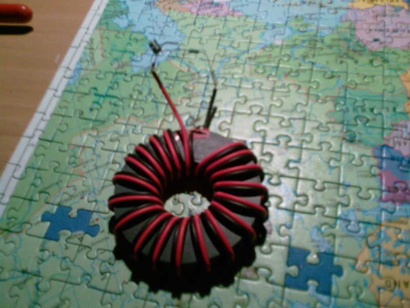A trafót egy 8mm átmérőjű 25mm hosszú ferrit rúdon készítettem el. Kicsit többet tekertem, mint az előírt 20, mert a vezetékem régi, a zománc itt-ott lekopott már az idők során, 0.3-helyet 0.4-es huzalom volt, és ezeket próbáltam kompenzálni kicsit. A két tekercs induktivitása nem sikerült egyformára, az egyiknek 15, a másiknak 8uH-it mért a műszerem (a legalsó 2 mH-s méréshatárban). Ez az első trafó, amit magamnak tekercseltem, úgyhogy elég csálé lett...