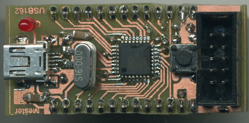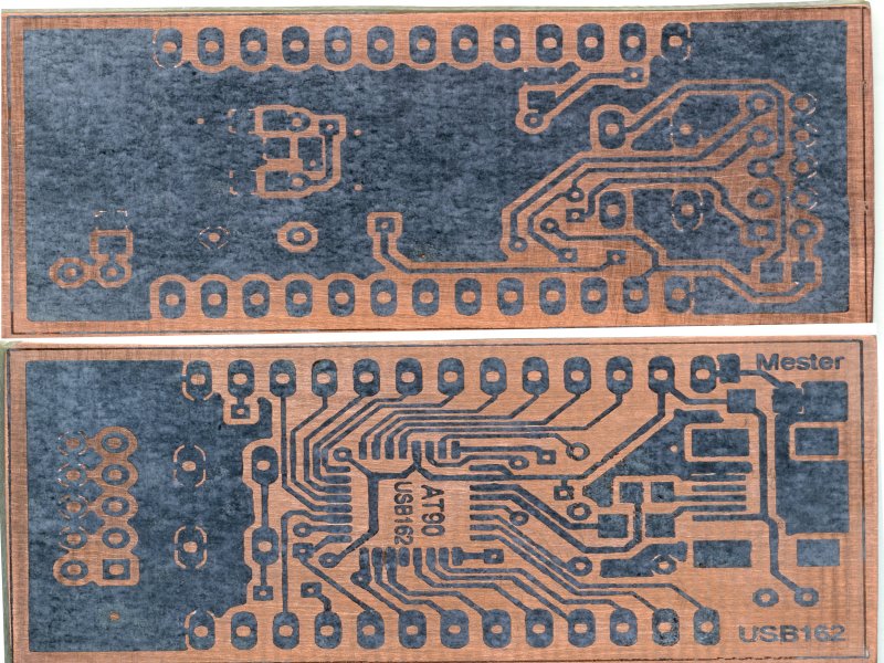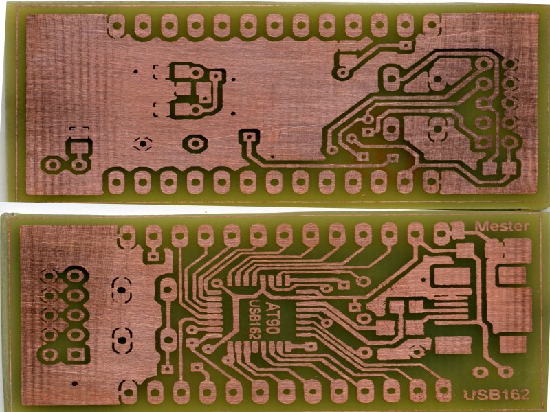 Készítettem egy próbapanelre felszúrható Atmel AT90Usb162 nyákot. Az ötletet a Teensy board adta nekem. Elsősorban a nyomtató képességeit akartam dokumentálni. A NYÁKot vasalásos technikával készítettem, TN 150-nel martam. Beszéljenek a képek.