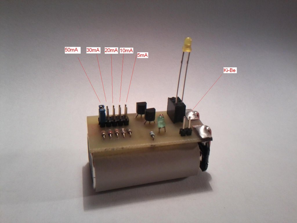 Ma készítettem egy mini LED-testert. Jumperel tudom állítani az áramerősséget. Van rajta 1mA-eres állás ekkor egy jumper sincs rajta. Utána 5 10 20 30 50 mA-es állások vannak. Plusz van még egy jumper azzal rudom ki-be kapcsolni. Az egész egy 9V-os elem méretű. Csinálnom kellett az elemre egy kis zoknit mert az elem rövidre zárta a nyákot. Ezt a zoknit ponyvából csináltam. Jöjjenek a képek:
