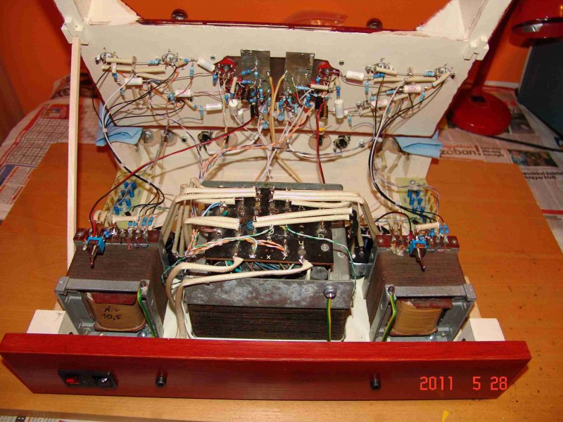 Kb. 1 hete lettem kész a csőves erősítőm újra építésével. a réginek nem volt rajza, semmi dokumentációja, ezért elhatároztam, hogy új "köntösbe" szerelem. Hasonlít az előző verzióra, de a trafón kívűl minden új benne.
