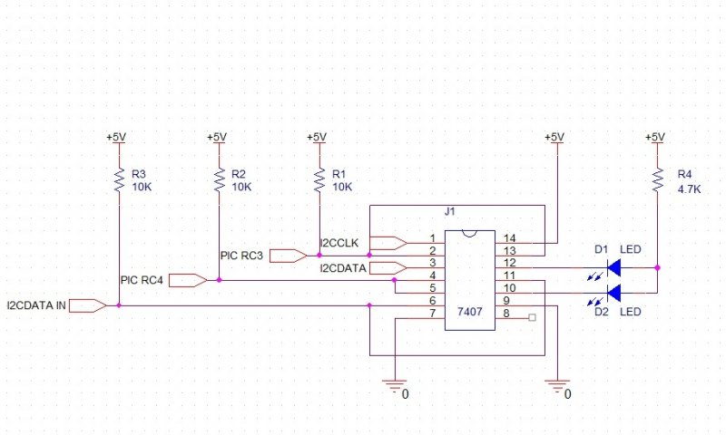 A 7407 nem helyettesíthető a 7404 gyel: Az I2C SDA jele kétirányú jel, a 16F877A és a meghajtó is adhat ki adatot. Ide legfeljebb a 74LS07 tehető be. Ráadásul a 7404 invertál, a 7407 pedig nem invertál.