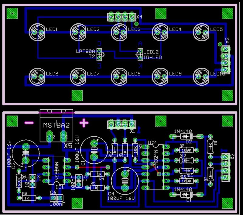 A pdf egy 10x16cm-es nyákra készül, tartalmaz 20db LED panelt, ezzel az SMD RGB LED-del: Bővebben: Link, és 20db vezérlő panelt. Kapcsolási rajz, és nyákterv, amin egyedül van a vezérlő és LED mellékelve Eagle formátumban. Nemsokára ki is lesz próbálva, hogy hogyan működik. Az RGB LED-ek úgy vannak bekötve, hogy jumperrel kiválasztható, hogy kék-piros, vagy piros-zöld színek világítsanak (a kék-zöld nem elég látványos, azt ezért kihagytam). A vezérlő nyákon az IC alatt található az "antenna" forrpontja, ide kell vagy merevebb drót, vagy vezeték, lehetőleg a két mozgására merőlegesen relatív nagy felülettel, ami lehet akár kör, vagy bármi.