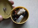 Ez egész korrekt lett, egy csavarral van lefogatva a nyák, minden más ugye felcsavarozva a dobozra, tyúkbelek gondosan összevissza, némi szigszalaggal, kapcsoló átmenetileg pillanatragaccsal, belül az aljára ragasztottam gumibelsőt, hogy ne legyen zárlatos. A kapcsoló csavar nem árt ha van