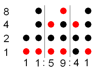 És eszt ábrázolják oszloponként. Első oszlop az óra tízeseit ábrázolja. Az Az oszlopon a ledek lentről felfele ennyit érnek: 1-2-4-8. És azokat kell összeadnod.