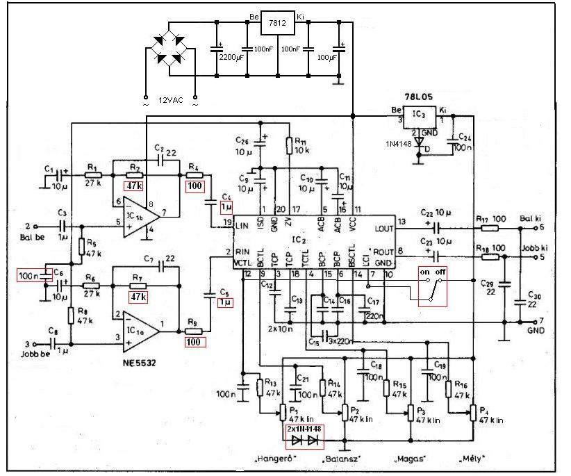 A "+" jellel kiegészített kondenzátorok elkók. A mértékegység nélküli kondik pF-ban értendők. Az NE5532 nyákterve teljesen rossz.