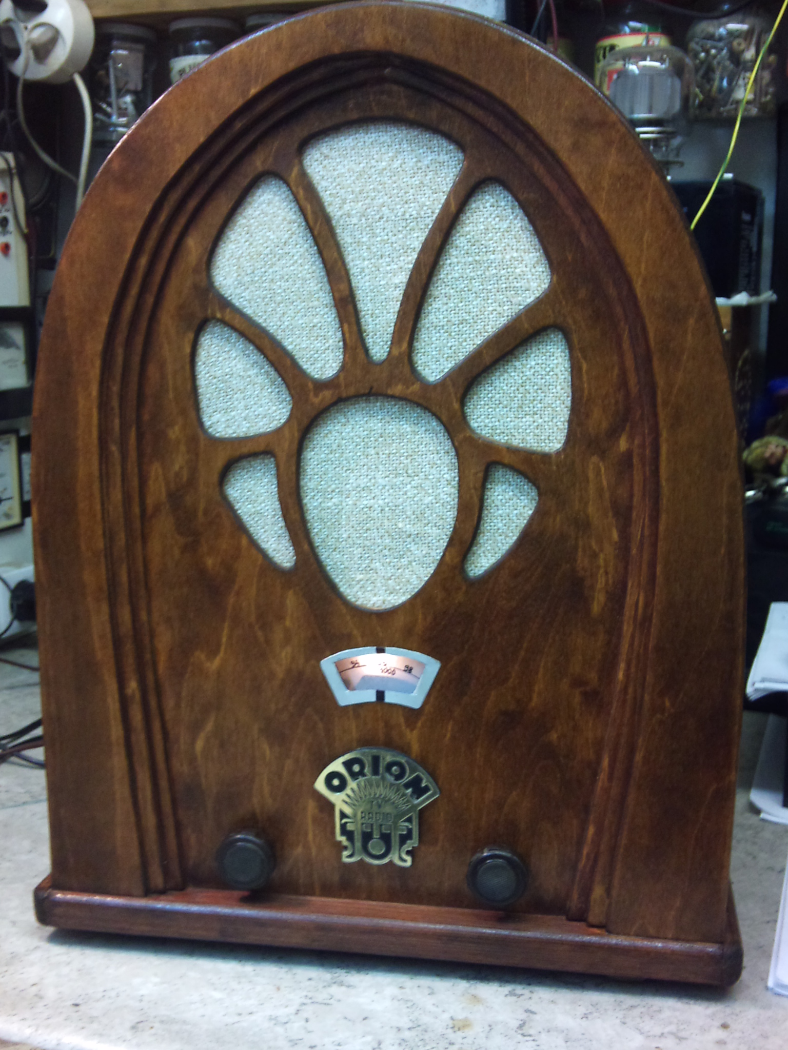 Mivel jól felemlegettetek, ezért tudatom veletek, hogy kész lett ma a nagy mű! A szupreg FM vevő működött,(ECC85-el) viszont olyan kicsi volt az érzékenysége, hogy a tőle 1,5m-re lévő transzmitter jelét fogta egyedül, és nagyon halkan... (de működött!) Viszont mivel, én használni is szerettem volna a rádiót, itt nem állhattam meg! Restellem, de a könnyebb utat választottam, és csalni voltam kénytelen! /A képeken fellelhető!/ Ámde így is 99%-ban csöves! Sajnos az UBL1-ből nem jött ki hang, így a modernebb EBL21-et használtam fel. Így a csőkészlet: AZ1, E446, és EBL21! Üzemi feszültség 200V, fűtés 4V (AZ1) külön fűtőtrafóval, és a főtrafóról 6,3V az EBL-nek, 2W veszteséggel a 4V-os E446-nak 2ohm-on keresztül... Hátlapon antenna csatlakozás, és AM-FM átkapcsolási lehetőség. A skála matricázott CD-lemez "guriga" alsó kamulemeze. A tápkábel, eredeti csöves rádióról való, már nem annyira hajlékony, ámde sérülésmentes (OFC mi?) rozsdabarna "mazzag", és jó nagy bakelit dugó! A végén poénból felkerült a régi ORION embléma is...