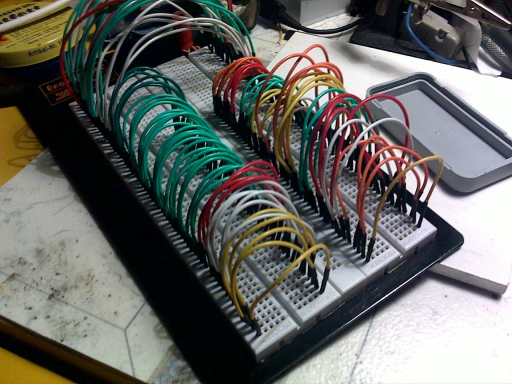 Meguntam a mindenféle szedett-vedett kábeldarabokkal breadboardon kínlódást, és rászántam egy fél napot egy normális kábelkészlet öszerakására. Volt készülékből bontott sokszálas vékony kábelem, meg szintén bontott merev telefon bekötő kábel, vettem hozzá 3 méter 1,5-ös zsugorcsövet, és a képeken látható kis szettet sikerült összeforrasztgatnom. 110 db-os kábelszett, minimális anyagköltséggel (KB 300 fT), amiből: 20 db 17 cm 20 db 14 cm 50 db 11 cm 20 db 8 cm hosszú vezeték jött össze.